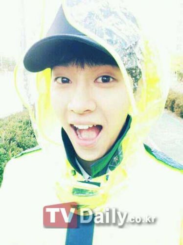 公开的照片中,李起光压低帽子,面带开心的大大微笑,看着镜头。而他身上穿着黄色系的雨衣,贴在脸上,像只可爱的小鸡一般,引人注目。