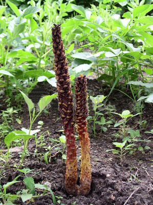不老草:学名草苁蓉,俗名列当。兰科,草苁蓉属。多寄生于海拔1450-1800米的陡沟式悬崖峭壁上的桤木属植物的根上,多年生寄生草本,高达0.5米,径达3厘米,直立,主轴较粗,茎肉质叶子鳞片状,花冠暗红紫色,穗状花序,花较小、筒部膨大呈束状,葫果卵球形。是长白山珍稀药用植物。以其特有的药理作用而名贵于天下。 民间传说有补肾壮阳、润肠通便、健体强身、延年益寿,长生不老的奇效.