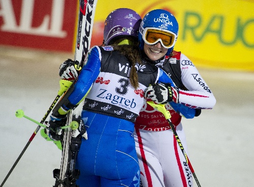 萨格勒布,2012年1月4日 (体育)(3)滑雪——女子高山滑雪世界杯赛况 1月3日,奥地利选手希尔德(右)与获得亚军的斯洛文尼亚选手马泽相拥庆祝。当日,在克罗地亚萨格勒布举行的高山滑雪世界杯系列赛女子回转项目比赛中,希尔德以2分1秒32的成绩获得冠军。