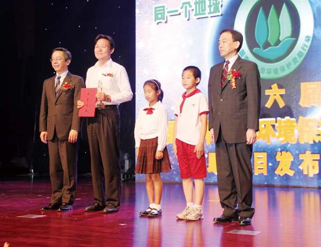 共青团中央书记处书记、全国青联副主席卢雍政(左一)、丰田汽车(中国)投资有限公司副董事长大西弘致(右一),为获得特别资助项目的单位颁发纪念杯和荣誉证书。手捧获奖证书的为中国环境科学学会秘书长任官平(左二),中间两位小学生为北京西城区奋斗小学的王佳琦和白也诗。