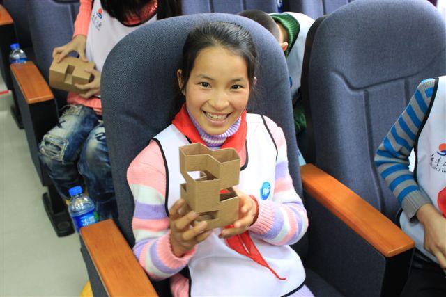希望小学的同学正在展示用再生纸制作的环保笔筒