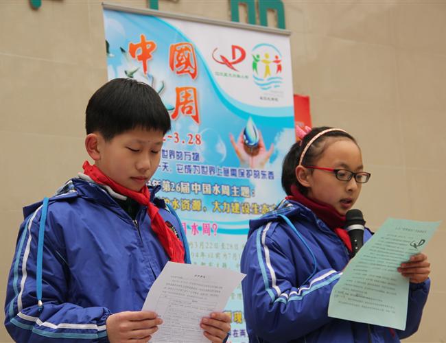 作为“长江水学校”成员,武汉大兴路小学在3月21日举行水教育主题宣传活动。学校大厅布置了内容丰富、图文并茂的水知识宣传展板;电视机滚动播放“世界水日”、“中国水周”PPT介绍;环境教育团队成员王秋芬老师作《珍爱生命之水》主题讲话;五(2)班的张晖敏同学宣读了《节约用水倡议书》,号召全校师生共同保护我们的生命之水。