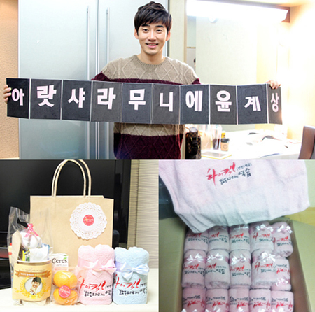 尹继尚的官方粉丝网站“爱人继尚”的会员们来到MBC情景喜剧《High Kick!短腿的逆袭》的拍摄现场,为剧组送上了100人份的夜宵大礼。