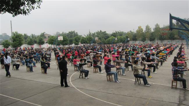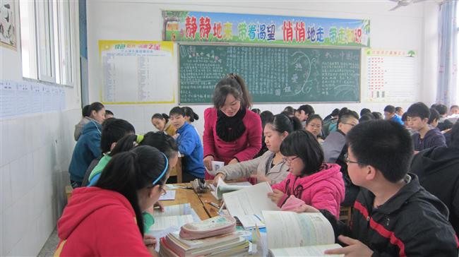 去的时候,正好是初三的学生在操场上做手操,诺大的操场全是人,各班都有老师跟班,有教练员在广场前带领大家做,显得井然有序。在校门正大门上悬挂着“热烈庆祝中国共产党第十八次全国代表大会顺利召开”的横幅,两边的墙壁上竖写着“励志文化润泽校园;特色教育幸福人生”,在每个班教室门旁的墙壁上都有一块一尺见方的牌子,上面有班主任寄语、班主任单人照,学生全体合影、班训。教室里课桌摆设成小组分堆式的,课堂氛围很活跃。墙壁上贴着各个学习小组的组名、组训、组规,有一块塑料牌子上写着小组组长、小组纪律委员、小组各大学科的代表。李燕老师是学校办公室主任,同时兼任九年级物理学科教学,她所主研的《物理课堂教学的结尾设计实践研究》已被广安市教委批准立项。