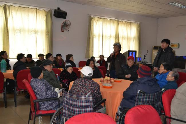 老年公寓创办人张院长向大家做了简单介绍。海淀龙泉老年公寓创办于1998年,一路走来非常不易,但为了老人们能有一个颐养天年的环境,再艰难他们也咬牙坚持了下来。目前院内有100多位老人,大部分都是生活不能自理的老人。在和老人交流的过程中,我们看到这里的工作人员对待老人细心体贴,房间卫生收拾的干净整洁,小院落给人很舒服的感觉。看的出,老人们在这里生活的舒心快乐。